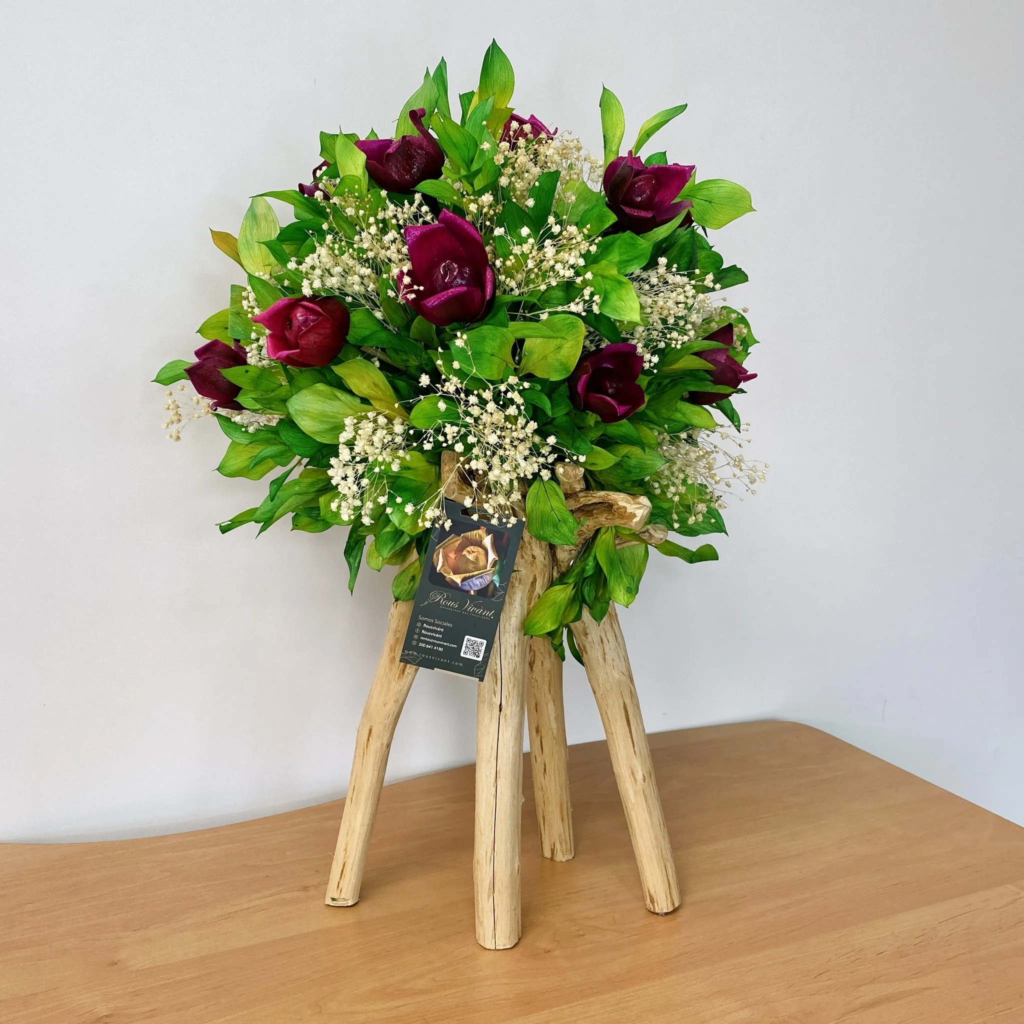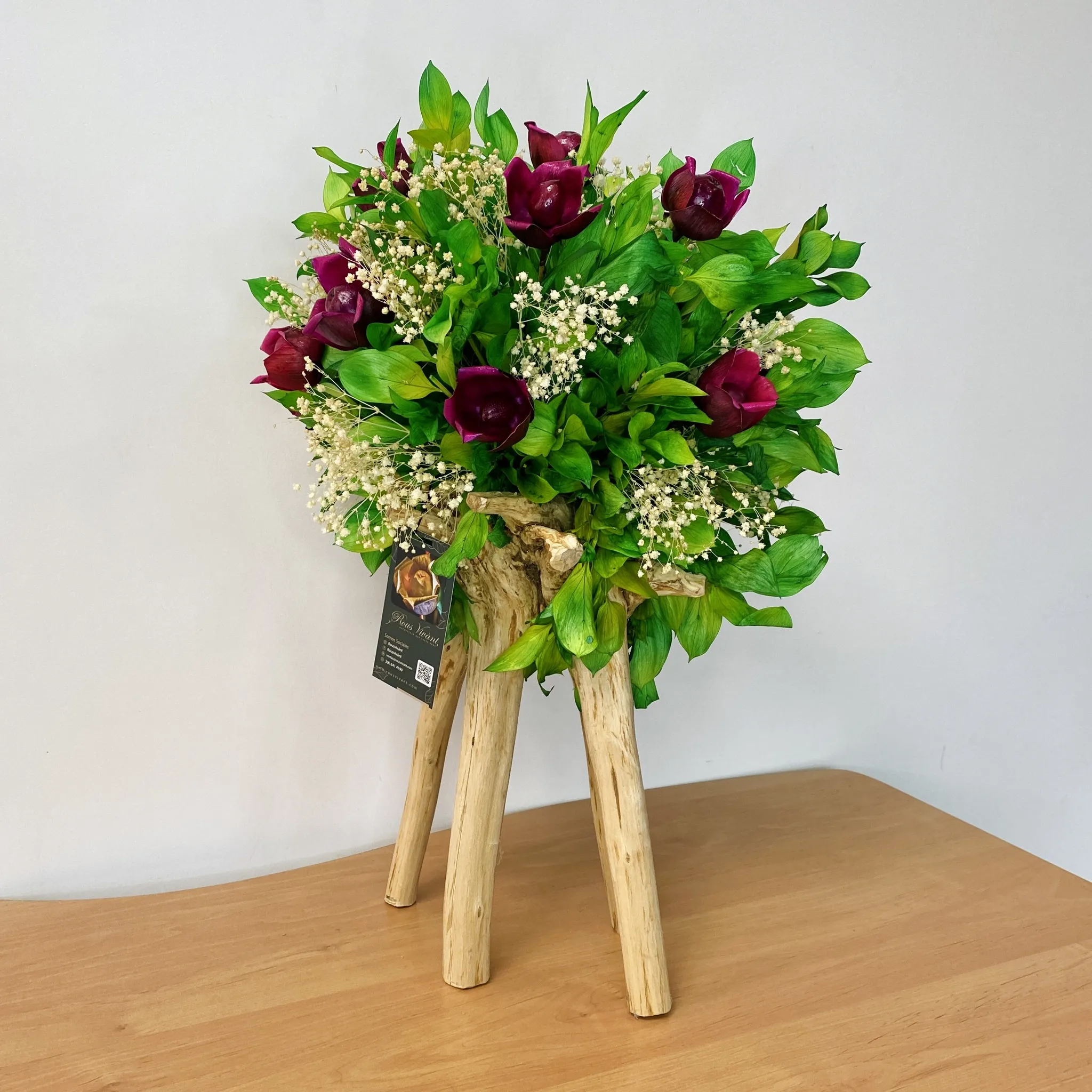 Arreglo floral decorado con la Rosa de Hawái sobre una raiz natural.